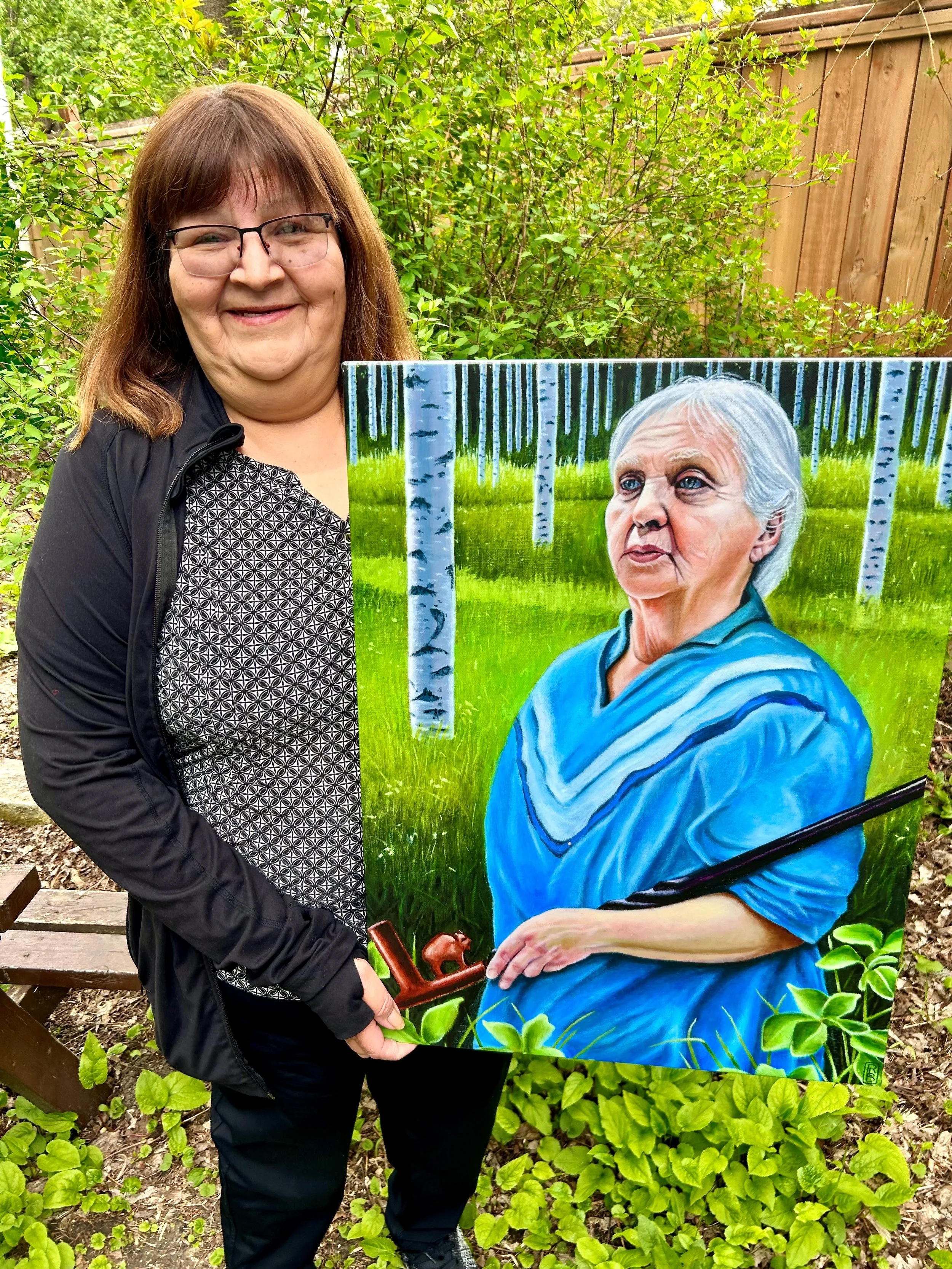 NEWC Family Advocate & Knowledge Keeper Claudette Okemow with gifted portrait of Elder Velma Orvis (1940-2020). Elder Velma Orvis had passed the Four Directions ceremony (for unsheltered relatives) to Claudette in 2019 and Claudette has since carried this ceremony out every December via NEWC.